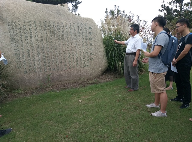 随后,人文学院院长刘红军带领学生来到《奉贤校区落成颂》碑石前,讲述了“落成颂”写作的缘起、过程及碑石背后的故事,介绍了“落成颂”的主要内容和艺术特色。 最后,学生们回到第五学科楼,围绕着“三校的基本精神是什么、十七年发展的主要精神力量是什么、我们能获得什么感悟”等问题展开了热烈讨论。同学们充分认识到了三校培养一线技术人才的办学思路和机制,以及对目前办学特色产生的积极影响,领悟到了学校十七年发展历程中“负重前行、奋力爬坡”的精神力量。